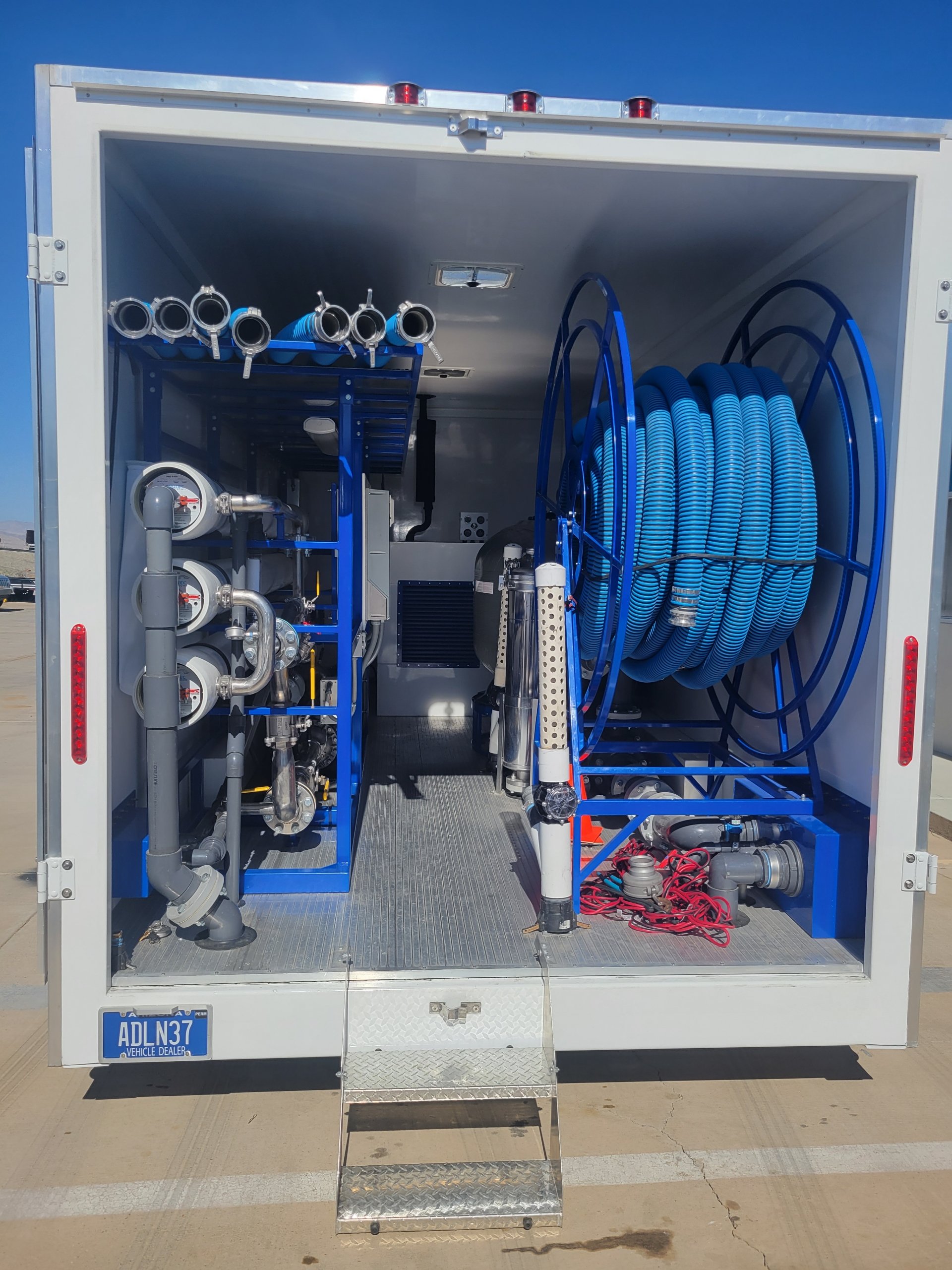 Get the most bang for your buck by utilizing our new 18’ water purification trailer. This trailer offers a 40 horsepower pump running from 150 to 180 gallons of water per minute at pressures from 425 PSI to 490 PSI, which makes this water filtration system deliver optimum performance, at all times. Our new deep bed sand filter ensures higher volume and flow and the new lightweight hoses are easier to handle. The hose reels are larger and have been moved to the rear of the trailer for easy access. Each hose reel handles a 50’ and 66’ length of hose for a total of 116’ on each real. Using cam locks to attach the hose-to-hose reel makes it much easier to connect, load and unload the hoses.